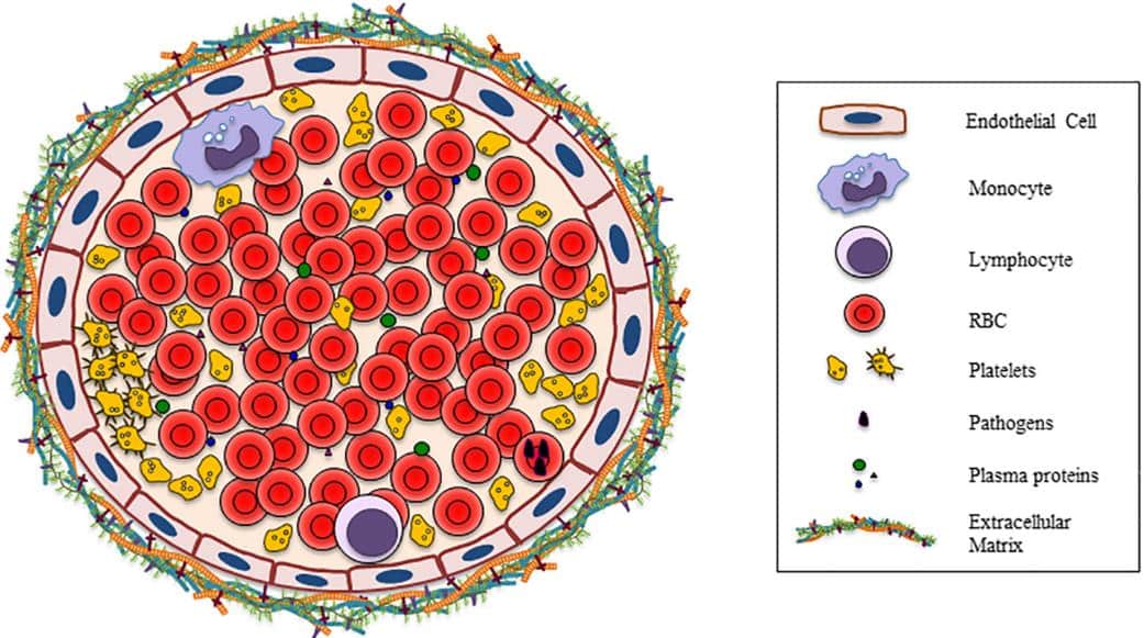 Fig.1 The vessel section depicts all conceivable cells, plasma proteins, microorganisms, and extracellular matrix that interact with RBC.1