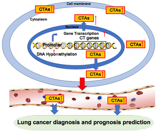 Fig.1 Oncogenic cancer/testis antigens as targets for lung cancer diagnosis and prognosis prediction.1
