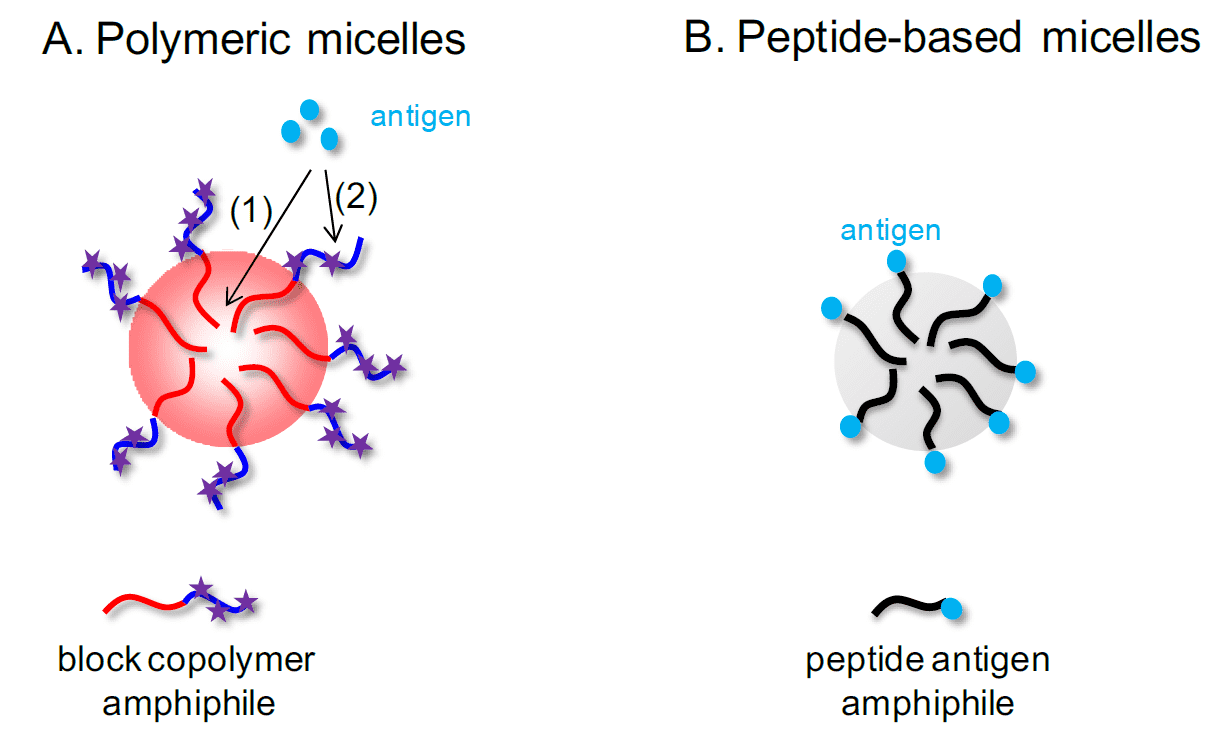 Peptide amphiphilic micelles are a class of biological materials that have unique potential as both self-adjuvants and vaccine delivery vehicles. Micelles are core-shell nanoparticles that spontaneously self-assemble in water to form single amphiphilic (hydrophobic/hydrophilic) molecules. Micelles have been used as drug delivery vehicles, and recently micellar nanoparticles have been explored as very valuable adjuvants for vaccine delivery by encapsulation/protection of hydrophobic drugs in the core of the micelles.